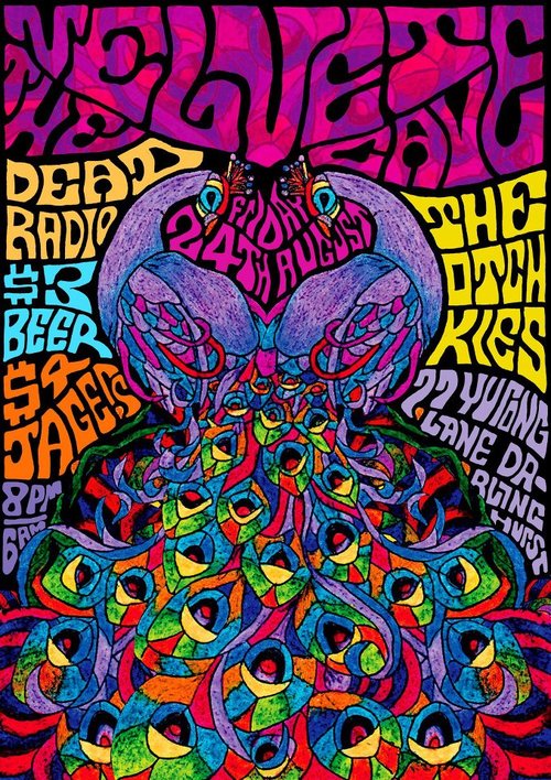 Music festivals and concerts were a prominent feature of the 60s landscape, and musicians such as Jimi Hendrix, The Grateful Dead, The Who, Janice Joplin were the super-stars of the day and from it a unique artform found expression in band posters.